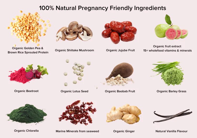 • Organic plant protein to support increased needs during pregnancy and help keep you fuller for longer.  During pregnancy the amount of protein you need increases up to 100g a day to help your baby develop skin, hair, fingernails, muscles and organs including their brain. It also helps support growth of your uterine and breast tissue and plays a role in the balance of fluids in your body - helping you maintain a normal blood pressure and preventing pregnancy swelling. A diet high in protein can also help to reduce pregnancy nausea.